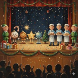 Η Χριστουγεννιάτικη Γιορτή «Κάθε χρόνο τα Χριστούγεννα!» μετατρέπει την αγωνία της προετοιμασίας σε παιχνίδι, αναδεικνύοντας το αληθινό πνεύμα των ημερών. Μέσα από ευφάνταστους ρόλους (Ζαχαρωτά, Στολίδια, Δώρα), τα παιδιά αναρωτιούνται για τα γνωστά διλήμματα των γονιών – από το ποιες λιχουδιές θα φτιάξουν μέχρι το τι δώρο θα επιλέξουν. Η διαδραστική αυτή παράσταση χρησιμοποιεί χιούμορ και τη συμμετοχή του κοινού για να καταλήξει σε ένα βαθύτερο μήνυμα: η μαγεία των Χριστουγέννων δεν κρύβεται στην τελειότητα του δέντρου ή του γλυκού, αλλά στη χαρά του να είμαστε όλοι μαζί. Η γιορτή ολοκληρώνεται με την αποστολή των γραμμάτων στον Άη Βασίλη και τα Κάλαντα, υπενθυμίζοντας σε όλους ότι η αγάπη και η συντροφικότητα είναι το πιο λαμπερό στολίδι των Χριστουγέννων!